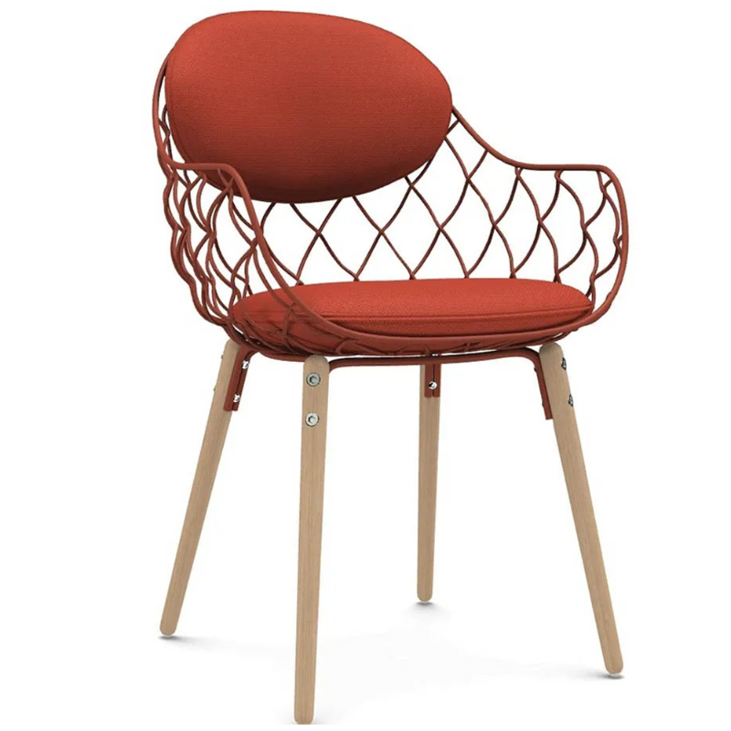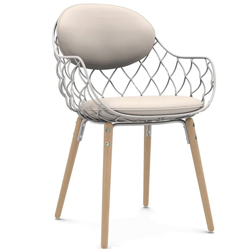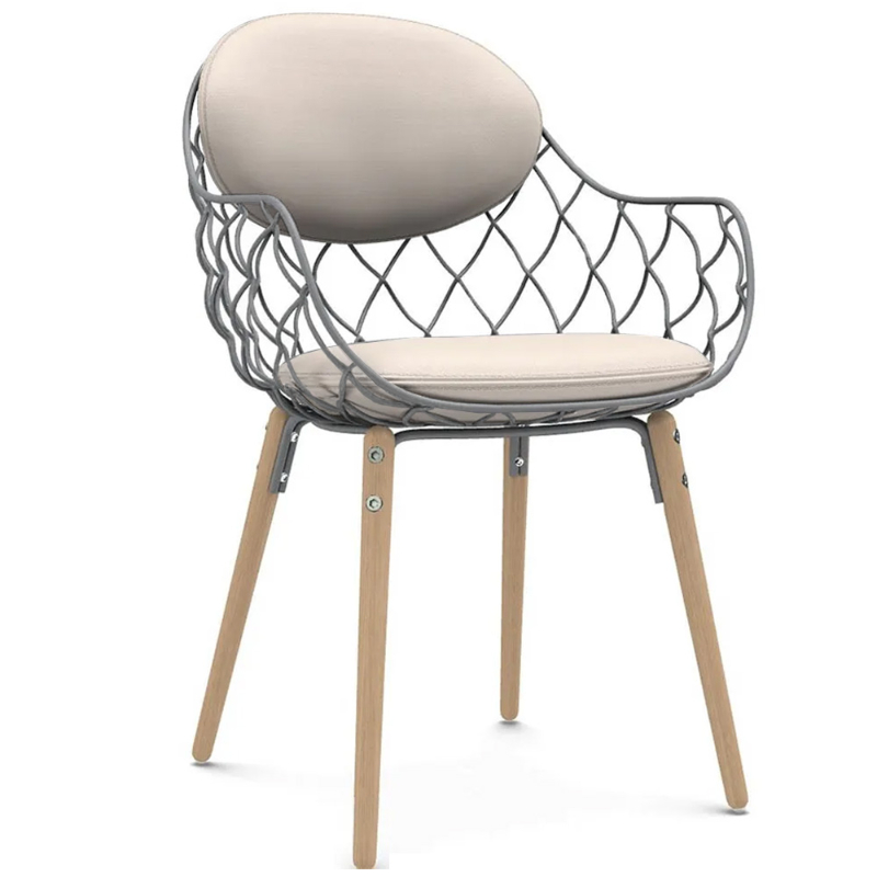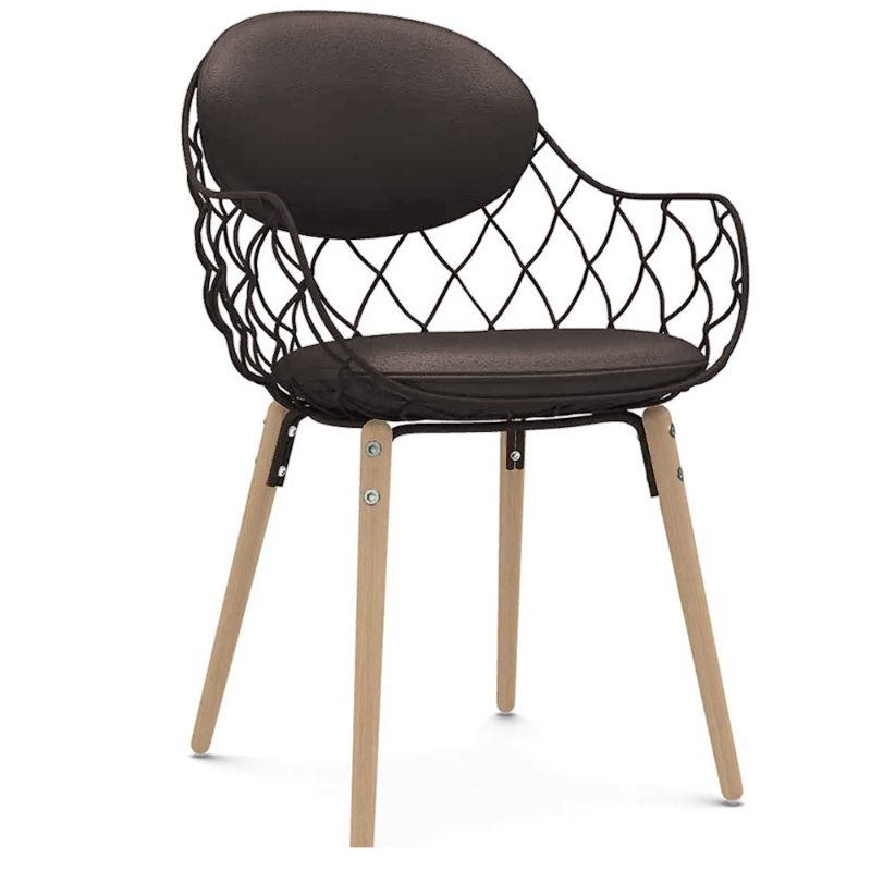 La silla de diseño Piña de Magis nace del deseo de crear un nuevo concepto para asientos, combinando sus características varillas de acero tejidas presentes en su asiento con la estructura de cuatro patas de madera maciza de fresno natural o barnizada.