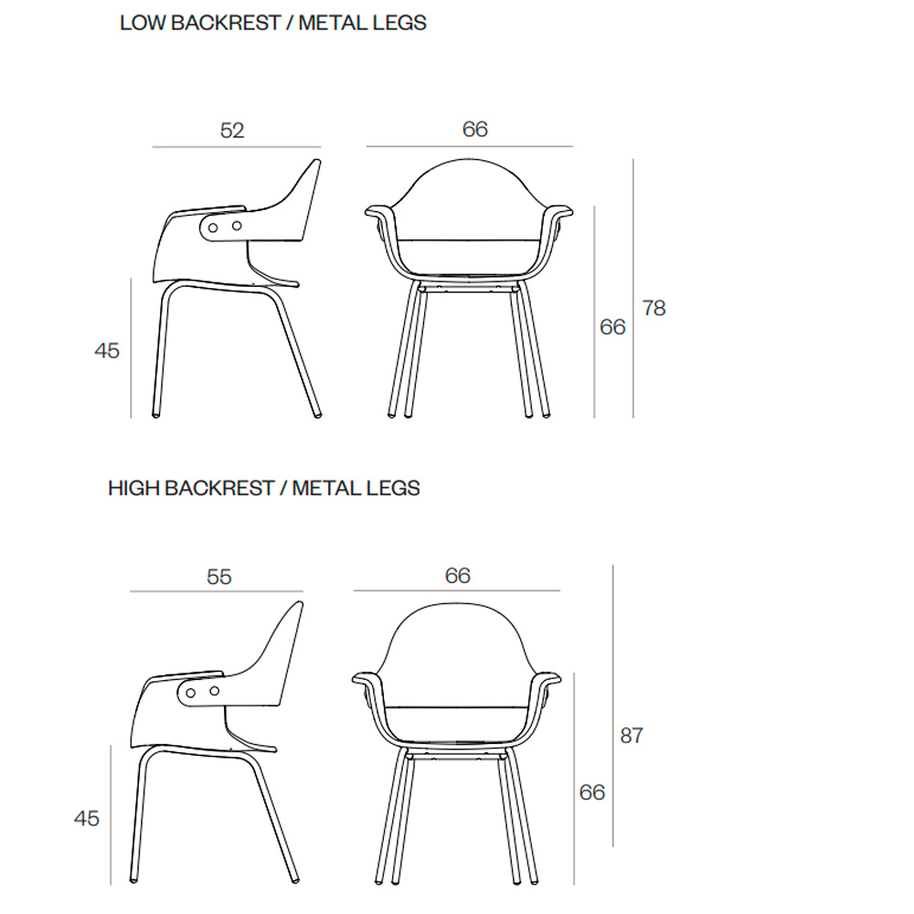 Silla con 4 patas metálicas y respaldo bajo o alto. Diseño por Jaime Hayon.