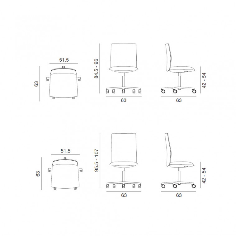 Silla moderna en base giratoria de 5 radios con ruedas autofrenantes con rodadura dura o blanda, en el mismo color de la base (a pedido) en aluminio lacado. Equipada con pistón de gas para regular la altura. Mecanismo autopesante sincronizado integrado en el asiento.