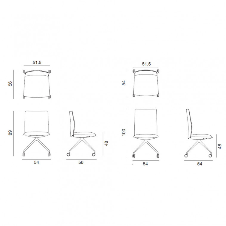 Silla moderna con base fija en aluminio con ruedas autofrenantes (en el mismo color de la base). Mecanismo autopesante sincronizado