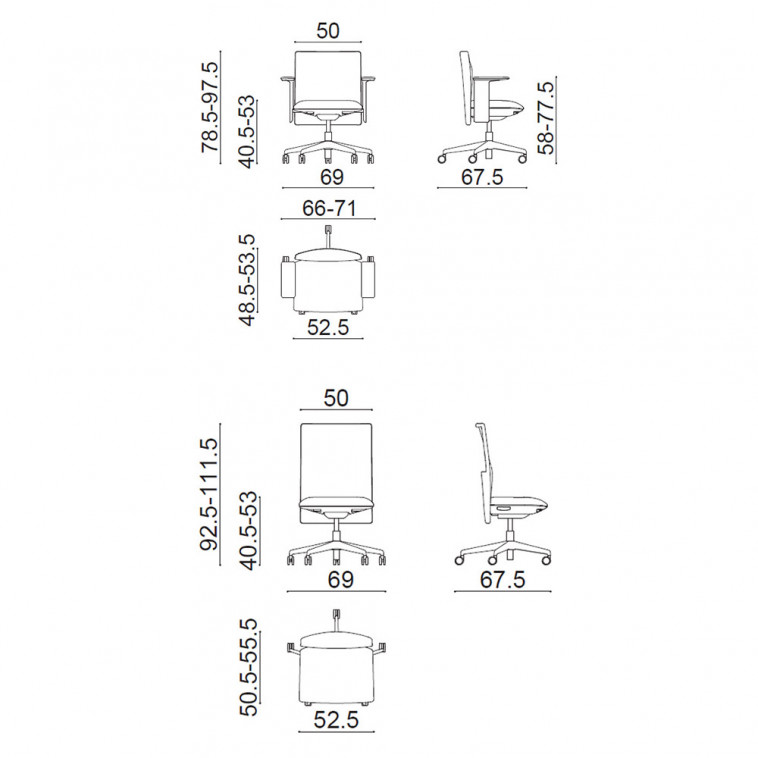 Una Silla moderna que se construye sobre estructura giratoria de cinco radios de nailon cargado con fibra (color blanco o negro) y con ruedas autofrenantes (del mismo color que la estructura, con banda dura o blanda). Dos opciones de Respaldo, alto o bajo con parte trasera visible del mismo color que la estructura y tapizado delantero en red de poliéster (color a juego con carcasa).