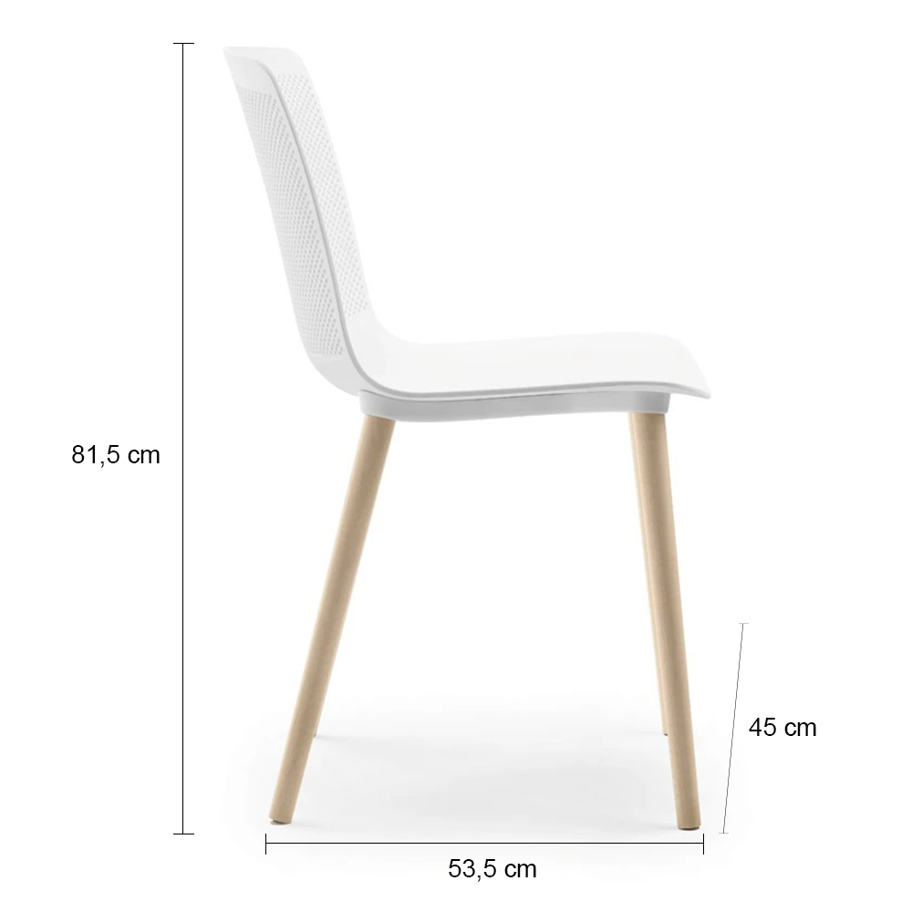 El diseño presenta un monocasco de polipropileno perforado o madera, con asiento tapizado unicolor o bicolor. Ofrece opciones de brazos, pala de escritura, y una estructura de acero o madera, cuyas formas redondeadas sugieren confort, haciéndola ideal para espacios contemporáneos.
