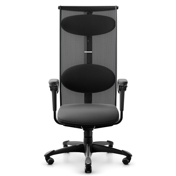 Integrado con apoyabrazos multifuncionales y regulables HÅG TiltDown™. El respaldo está tapizado en malla en Space oscura.