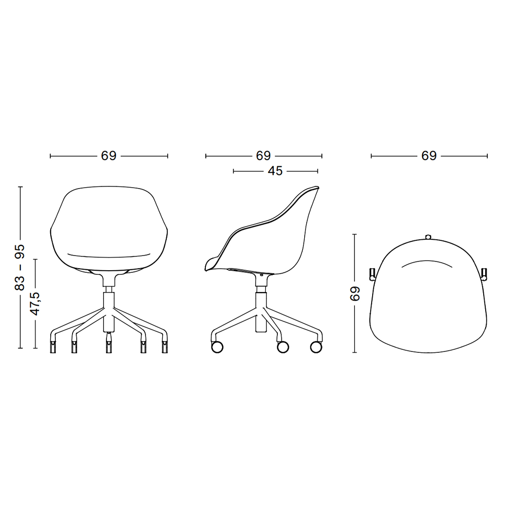 La base está disponible en aluminio pulido o recubierto en polvo negro, y la carcasa viene en una variedad de opciones de tapicería, proporcionando una multitud de combinaciones de diseño que le dan versatilidad a esta serie en una amplia gama de contextos corporativos, públicos y privados.