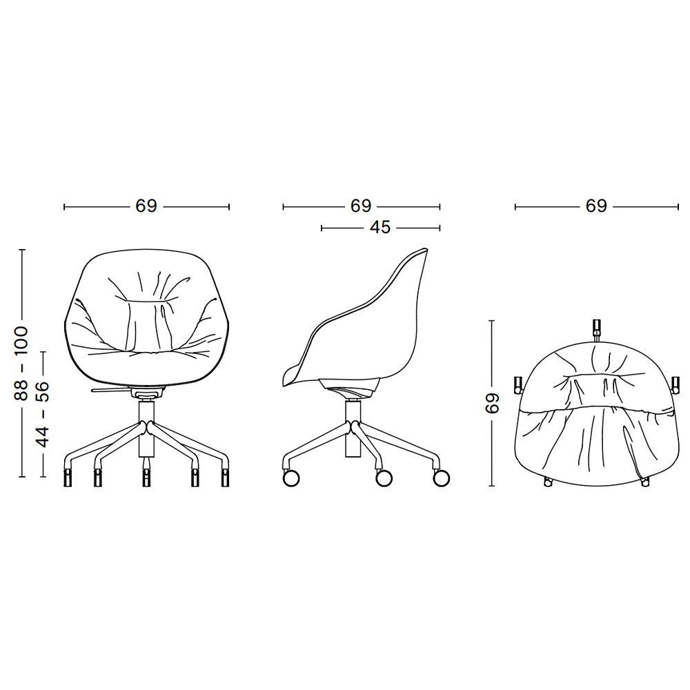 Silla tapizada acolchada, frente capitoné y base con ruedas. Dimensiones: 69x69x88/100h cm.