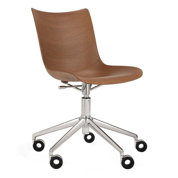 Estos nuevos sillones giratorios en las ruedas son la última incorporación al sillón colección. P / Wood se caracteriza por una carpintería, combinando elegancia atemporal con formas contemporáneas, y está disponible en tres variantes de color: madera clara con un blanco asiento y estructura cromada, madera oscura con asiento negro y estructura cromada o madera oscura con asiento negro y estructura negra.