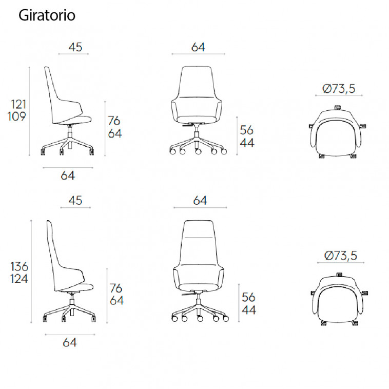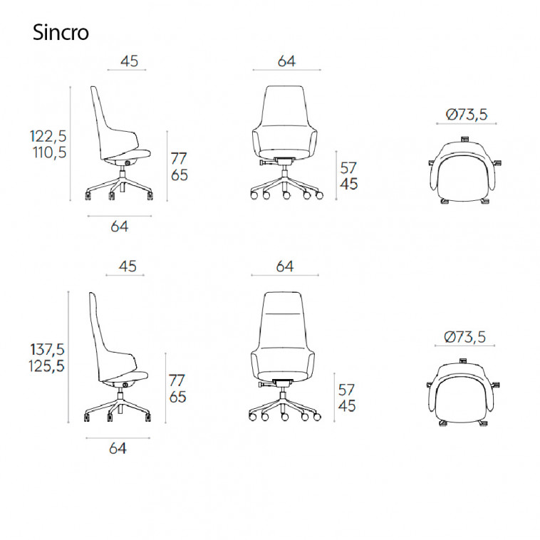 Las versiones de este sillón moderno con respaldo medio o alto, viene con una base giratoria de 5 radios de aleación de aluminio inyectado con columna de gas y ruedas dobles giratorias.