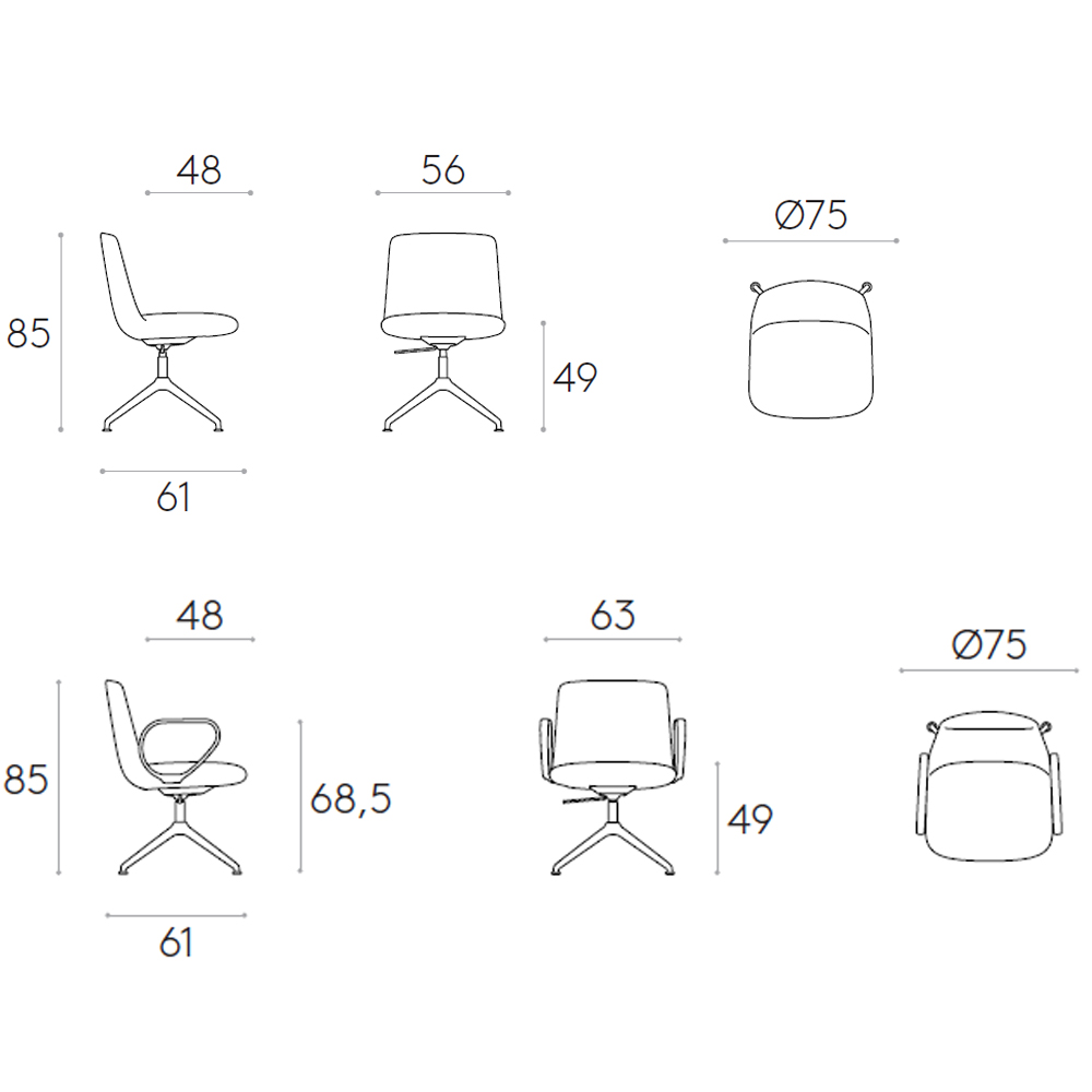 Silla tapizada con respaldo bajo y base giratoria de 4 radios de aleación de aluminio inyectado. La altura del asiento no es regulable.