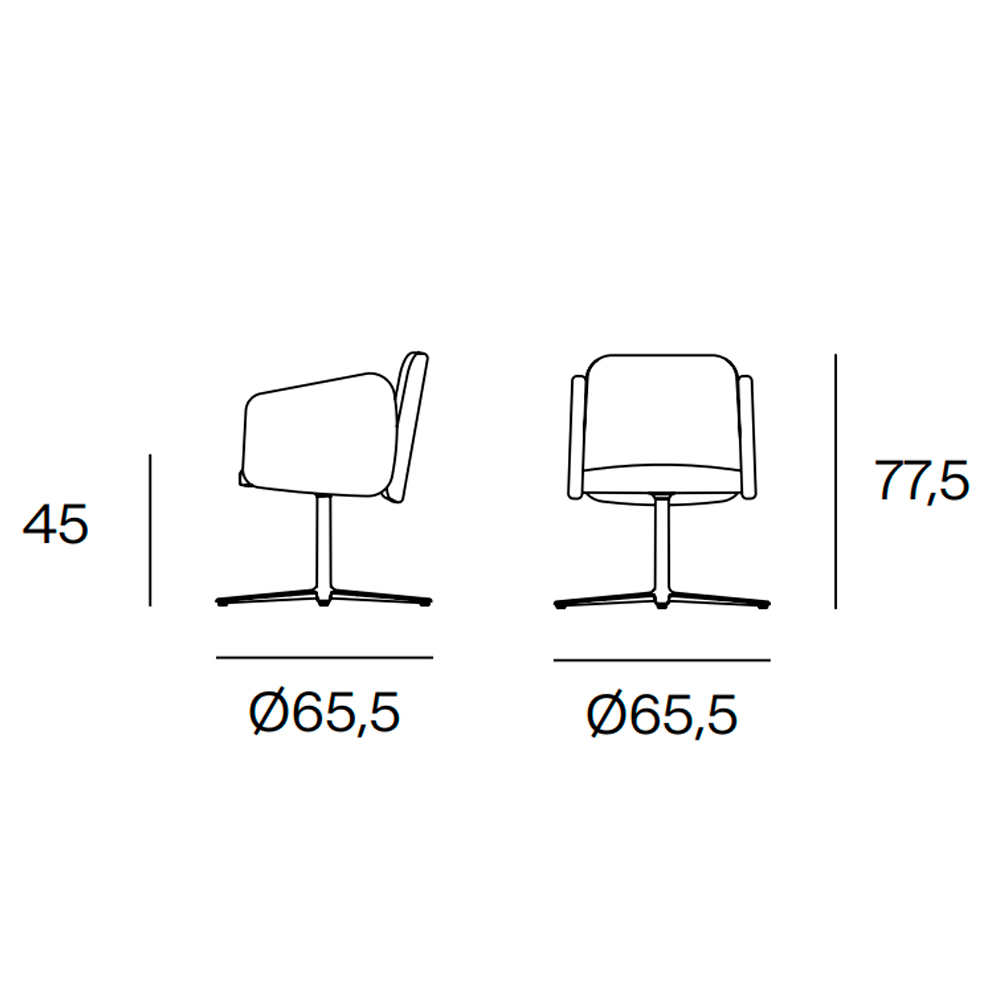 Sillón tapizado con base giratoria plana de metal. Dimensiones: Ø65,5x77,5h cm.