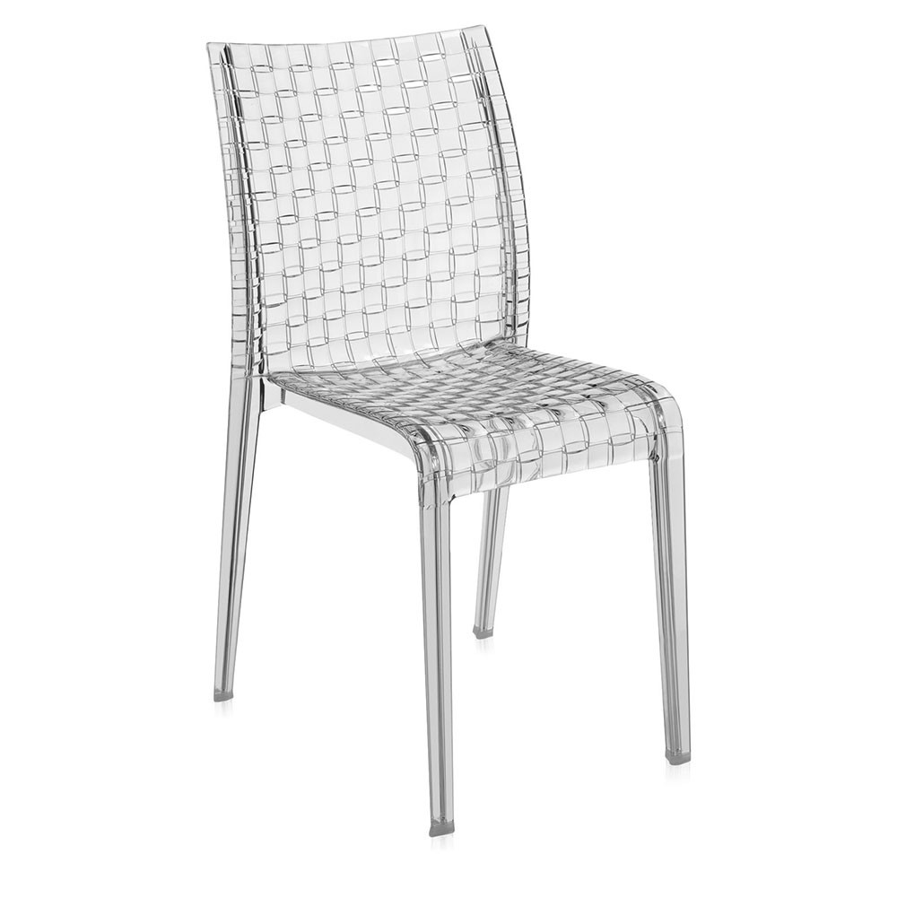 Silla de policarbonato transparente o colores opacos. Con un diseño inspirado en la trama o el trenzado de los tejidos que contrasta con las líneas simples y cuadradas de su estructura. Este diseño está inspirado en la cultura japonesa de su creador.