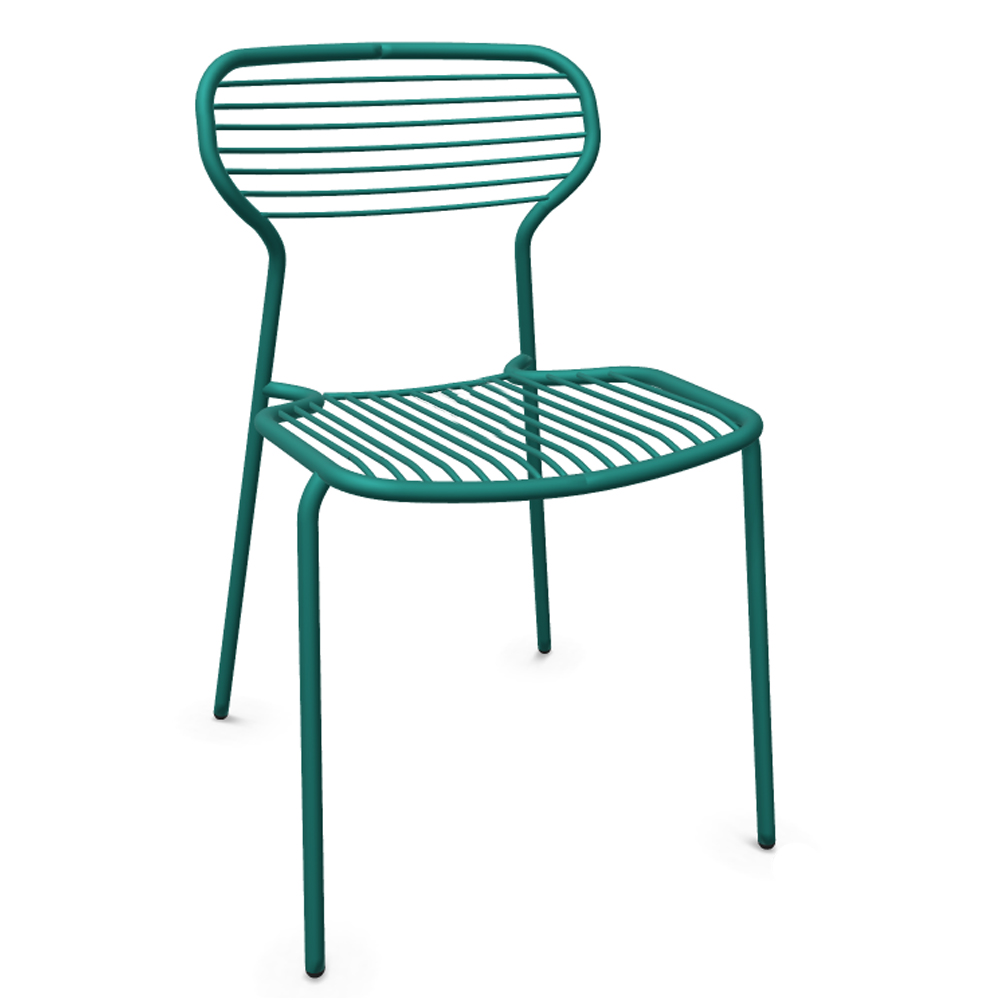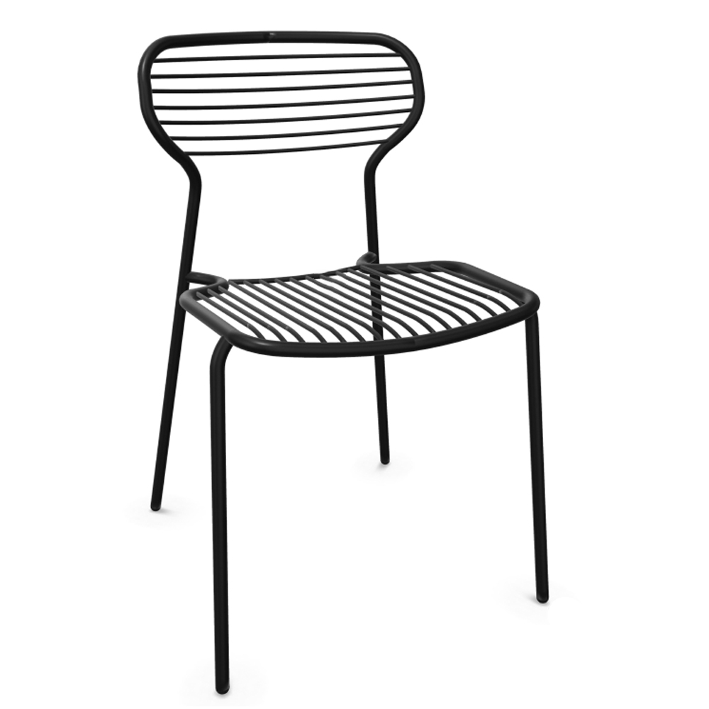 El trabajo del metal, el asiento y el respaldo de varillas de acero aportan ligereza visual y la silueta es continua y esbelta.