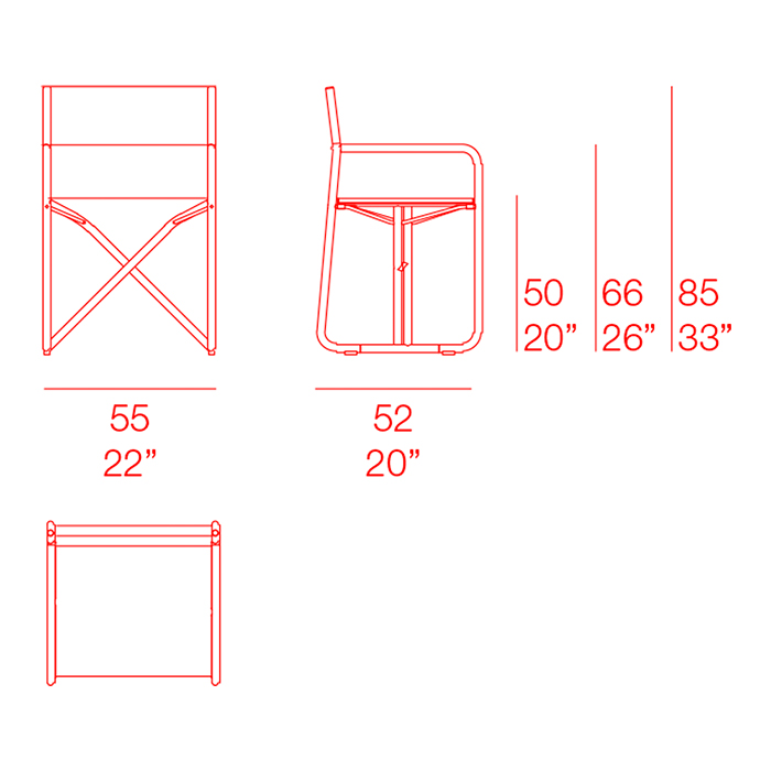 Silla director con estructura de aluminio y tela plástica. Dimensiones: 55x52x85h cm