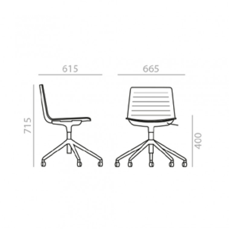 Silla con carcasa de termopolímero Eco sobre base central giratoria de aluminio con 5 ruedas, regulable en altura y acabado aluminio pulido, blanco o negro. Opciones disponibles: Carcasa tapizada y tapizado con costuras paralelas.* En versiones tapizadas la altura de asiento aumenta 20 mm.