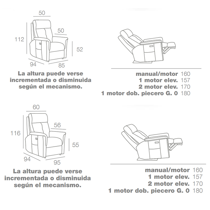 Sillón relax Cádiz está disponible en relax manual, manual giratorio balancín, relax 1 motor pared 0, relax 1 motor giratorio balancín, relax 1 motor elevador pared 0 y relax 2 motores elevador.