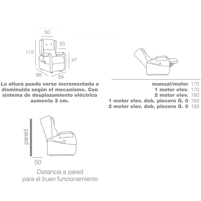 Sillón relax Boston en mecanismo manual, relax 1 motor, relax 1 ó 2 motor elevador + sistema de desplazamiento, relax 1 ó 2 motores elevador + sistema de desplazamiento. y relax 1 ó 2 motores elevadores + sistema de desplazamiento y doble piecero gravedad 0.