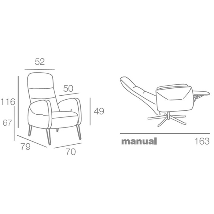 El sillón está disponible en relax manual con sistema de empuje y patas de metal.