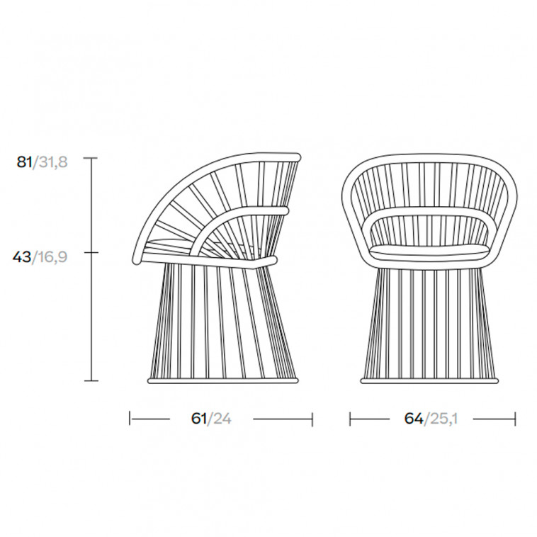 Sillón comedor para exteriores con pies en alumino y brazos con un tejido abierto de cuerda Bela Rope, de la colección Cala de Kettal.