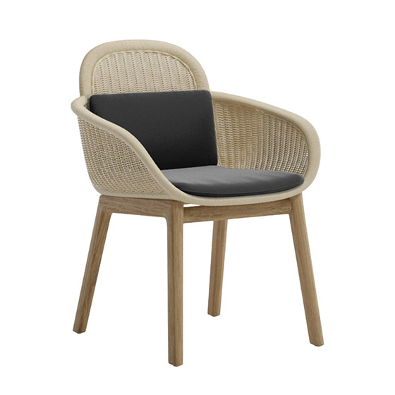 Sillón comedor con pies en Madera Teca, de la colección Vimini por Patricia Urquiola, creado con una estructura de madera, mas tosca y con una carcasa de fibra sintética.