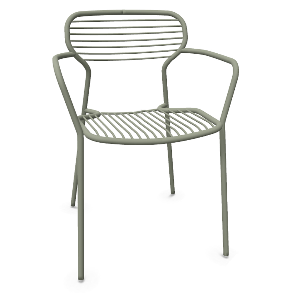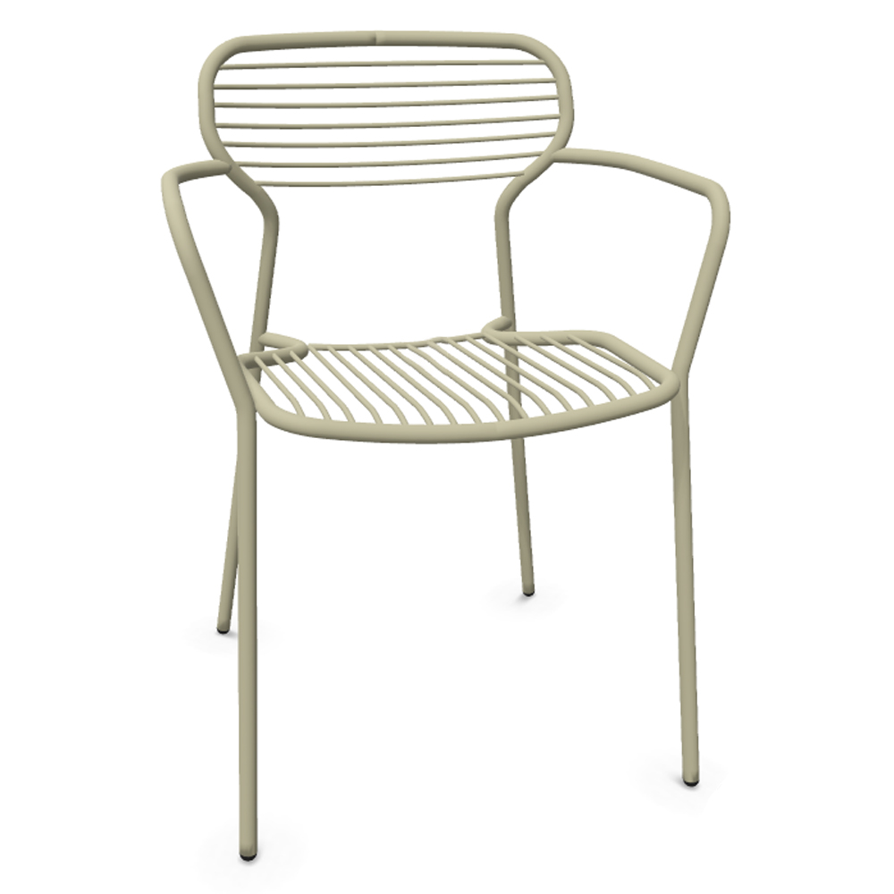 El trabajo del metal, el asiento y el respaldo de varillas de acero demuestran una ligereza visual y una silueta continua y esbelta.