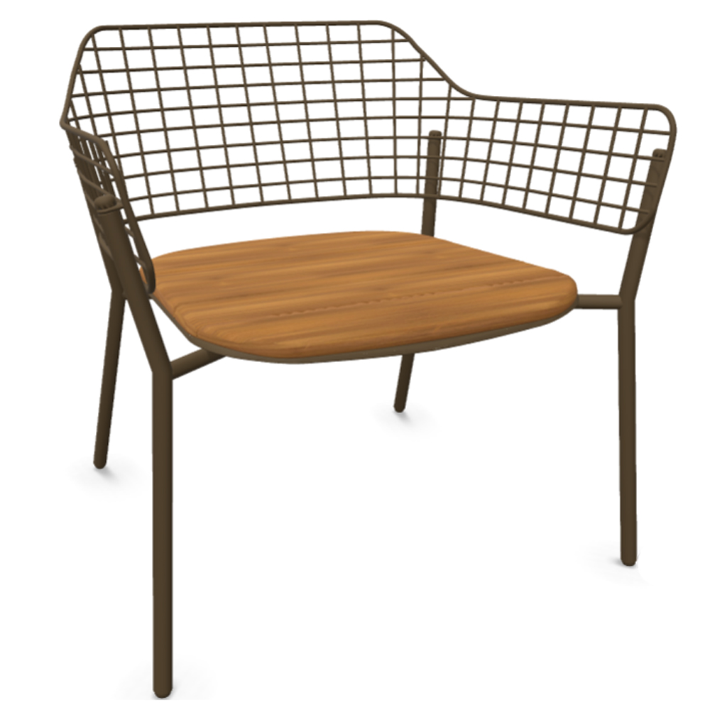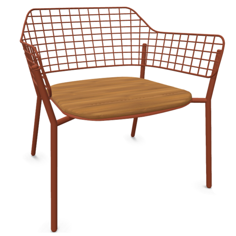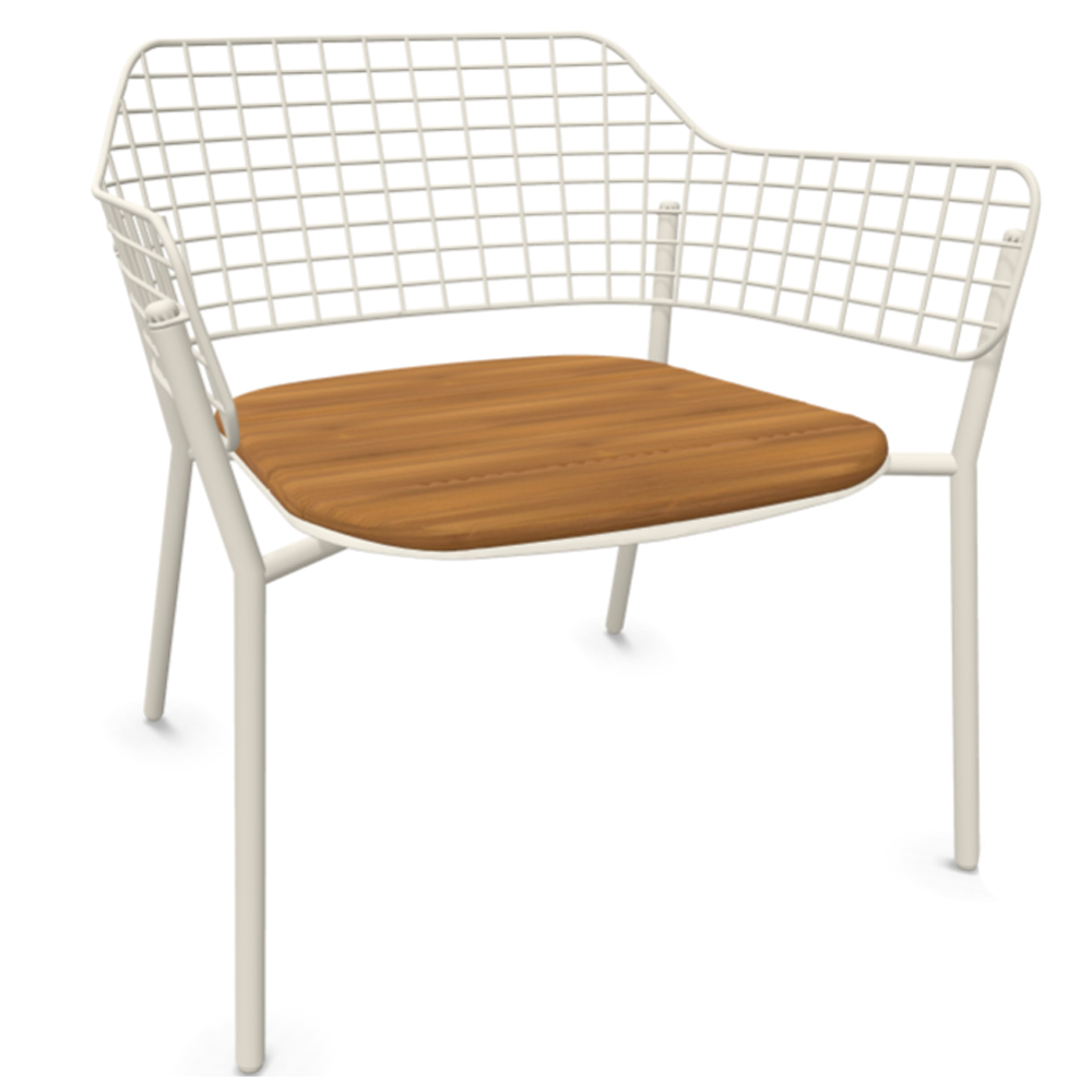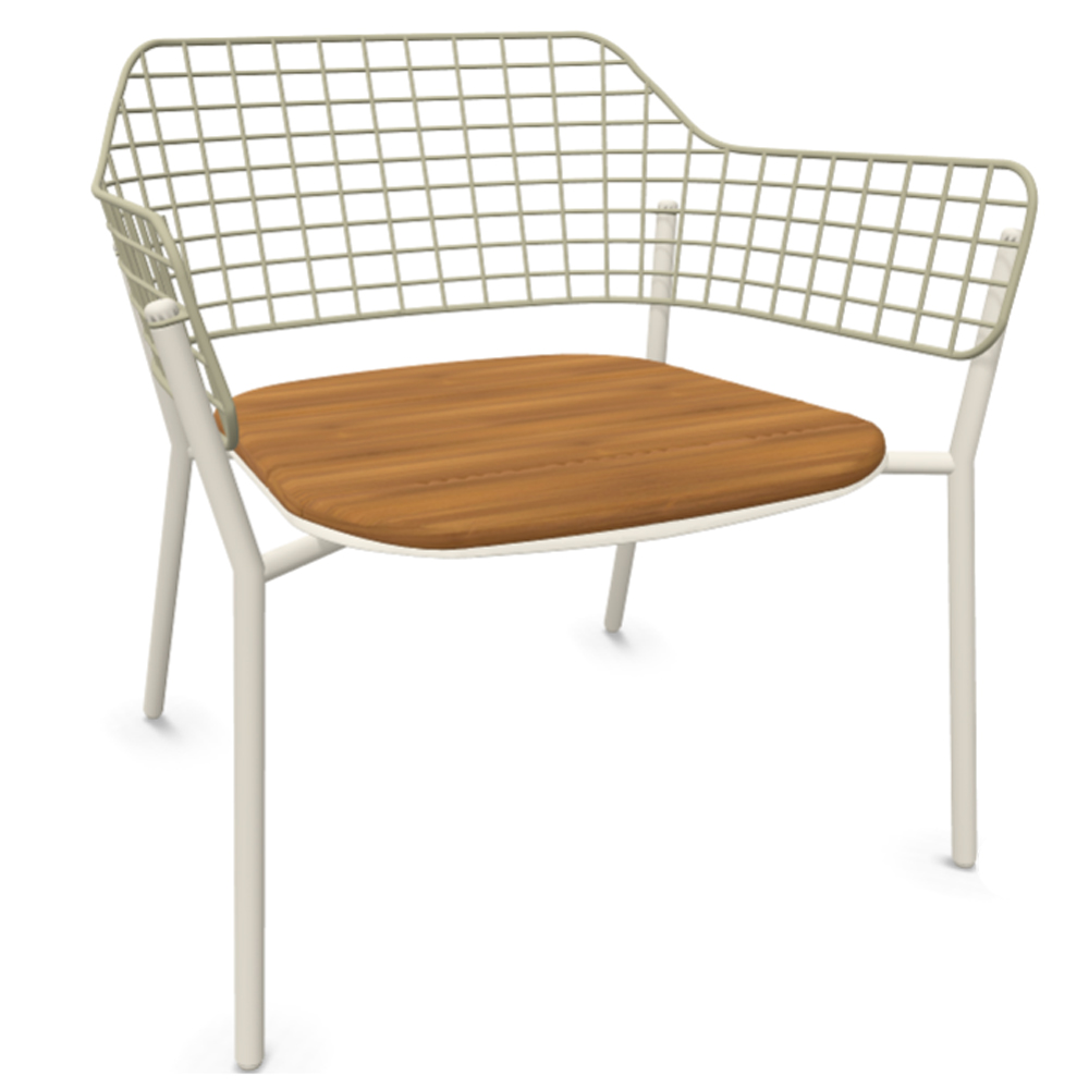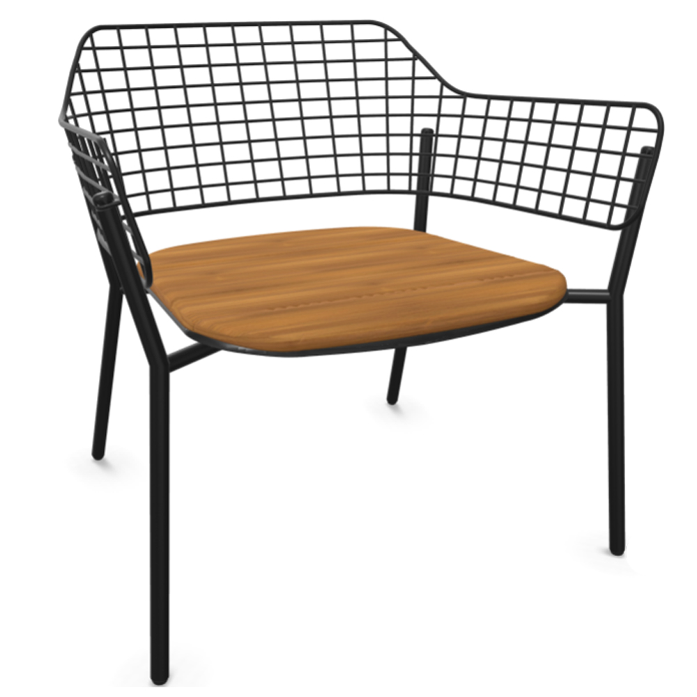 El original respaldo de acero inoxidable está fijado mecánicamente al asiento de madera de teca, permitiendo varias y sofisticadas combinaciones de colores.