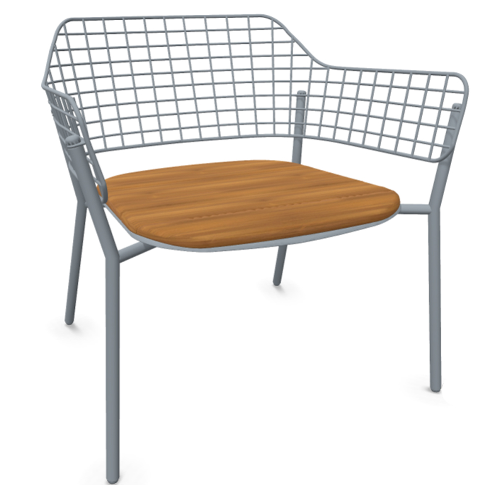 Butaca estructura de aluminio con asiento de madera teca. Dimensiones: 62x57x79h cm.