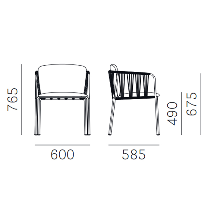 Sillón con estructura de acero y entramado hecho con PVC extruido con núcleo de nylon que envuelve los reposabrazos y el respaldo. El encordado, fabricado en Italia por expertos artesanos, se estrecha en la parte inferior del asiento y se ensancha hacia arriba para recordar la geometría en forma de abanico inspirada en el respaldo del sillón Serenella.