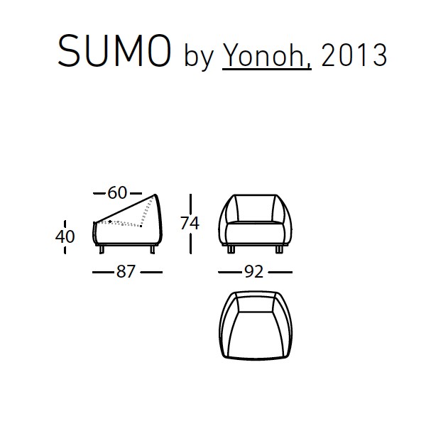 El concepto, como su nombre indica, parte de la robusta fisonomía de los luchadores de sumo y contrasta con la ligereza de la base, inspirada en los zuecos que los transportan fuera del ring. A pesar de su oronda presencia, Sumo ocupa un espacio muy reducido gracias a sus compactas dimensiones (92 centímetros para el sillón).