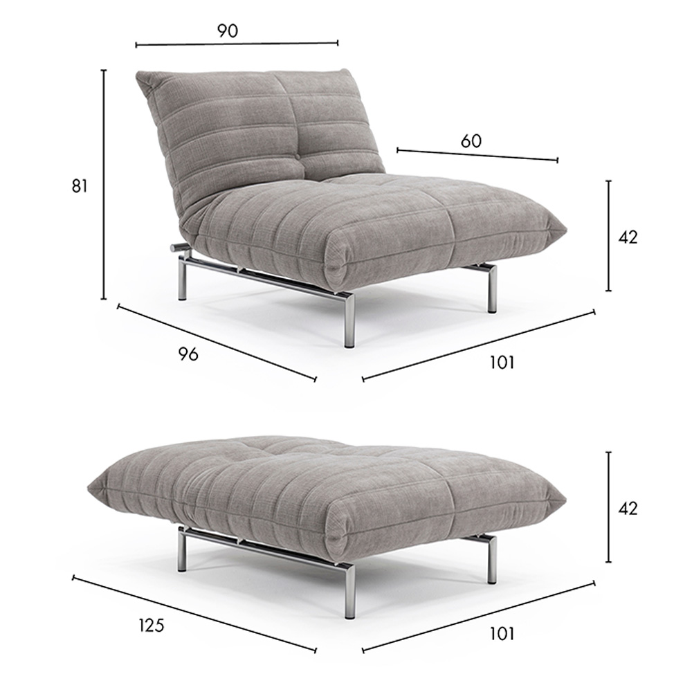 Sillón cama tapizado con patas cromadas. Dimensiones: 90x96x78h cm.