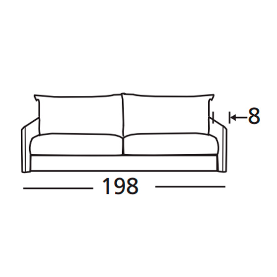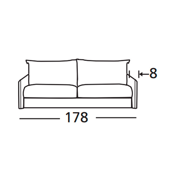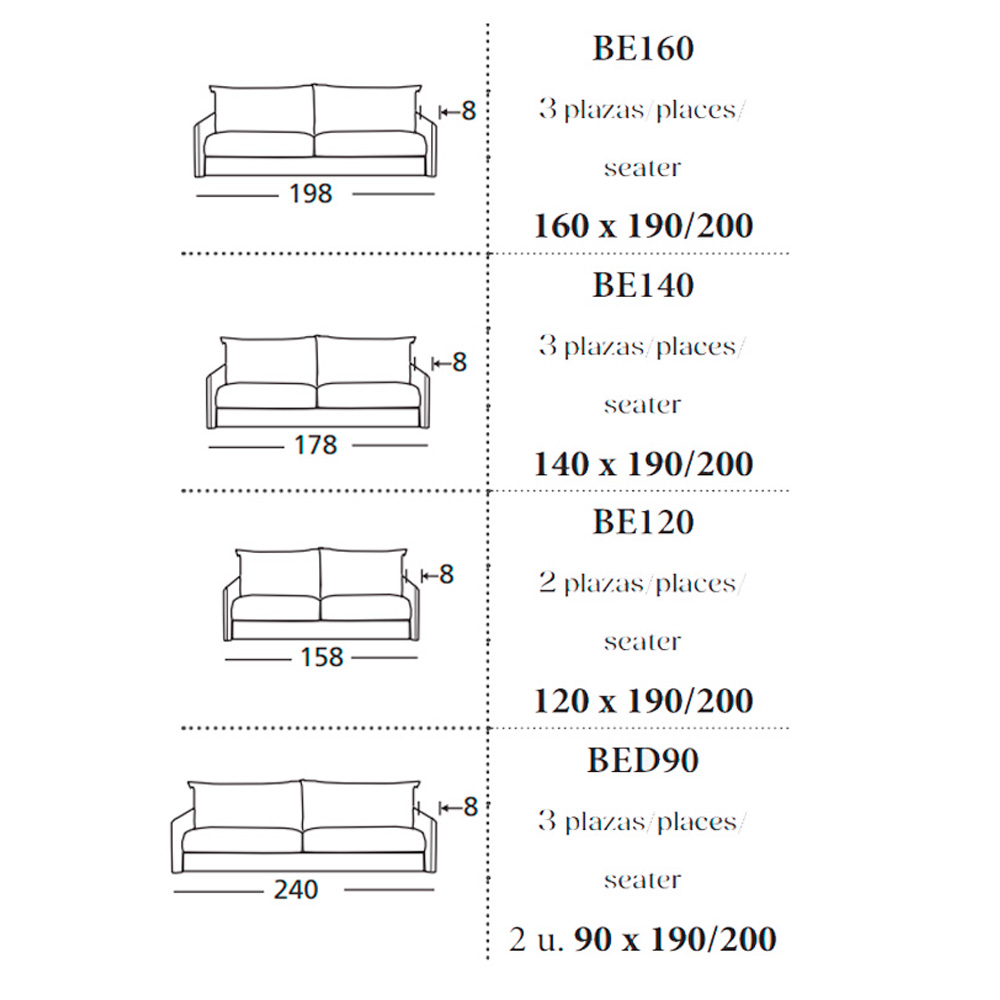 Sofá cama con sistema de apertura italiana y brazos estrechos tapizados.