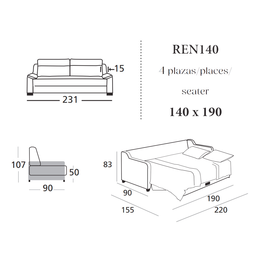 El sofá Rennes presenta un mecanismo con una sencilla apertura de un solo paso. Un sofá de 4 plazas que ocupa lo mismo que un modelo de sistema sistema italiano de 3 plazas. Cama de 140 x 190 en sentido horizontal con un colchón independiente al asiento. Se sirve con los brazos desmontados para facilitar los traslados.