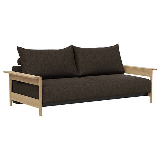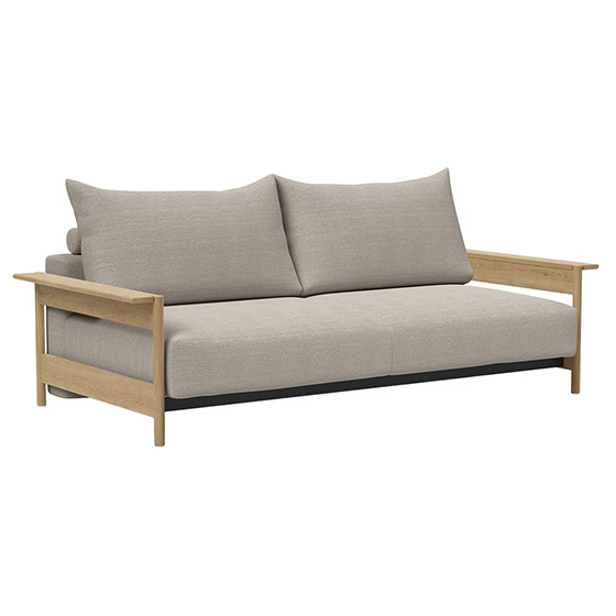 Sofá cama matrimonio con brazos y patas de madera de roble. Dimensiones: 230x118x90h cm.