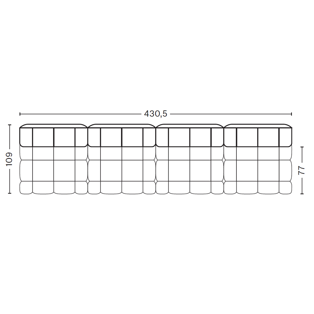 Sofá Lineal tapizado sin brazos en sus extremos. Dimensiones: 430,5x109x72h cm