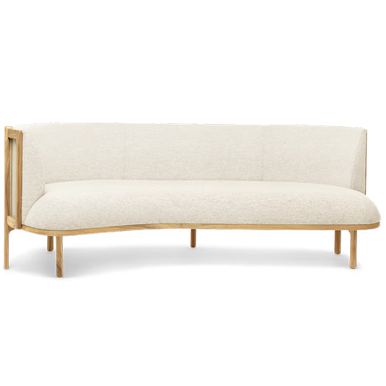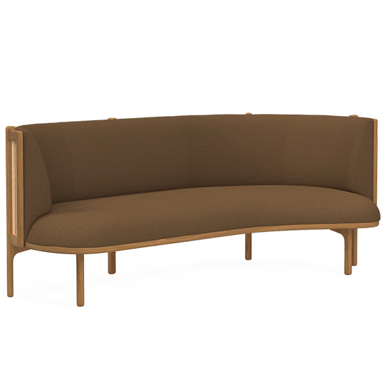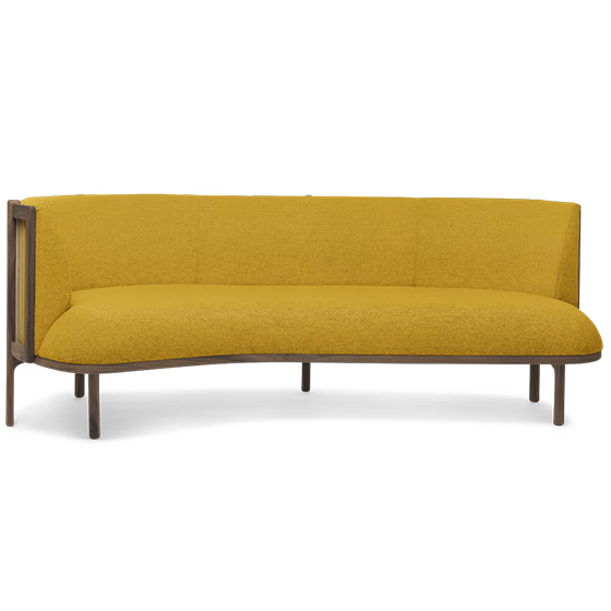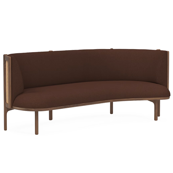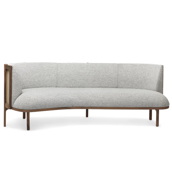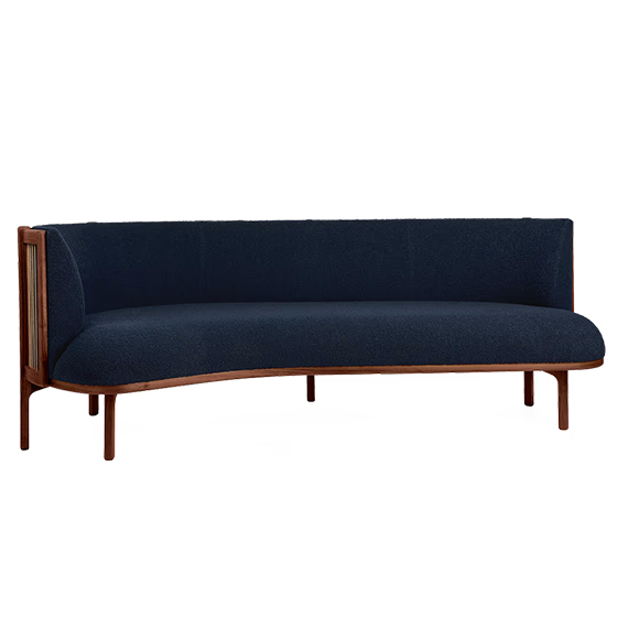 Combina materiales clásicos (madera, cordón de papel y tapicería textil de alta calidad) con una forma asimétrica moderna.