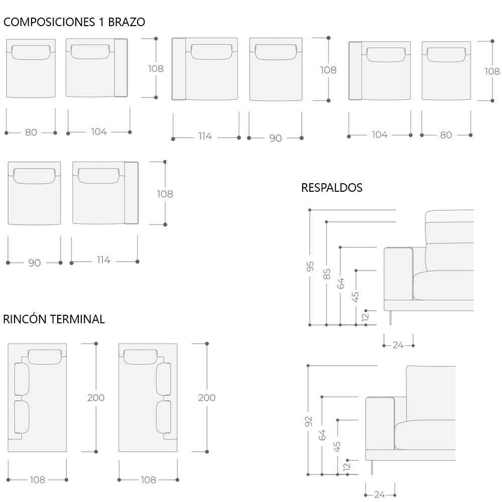 - 204x108 cm - MÓDULO CON 1 BRAZO IZQ (114x108 cm) + MÓDULO SIN BRAZO (90x108 cm)