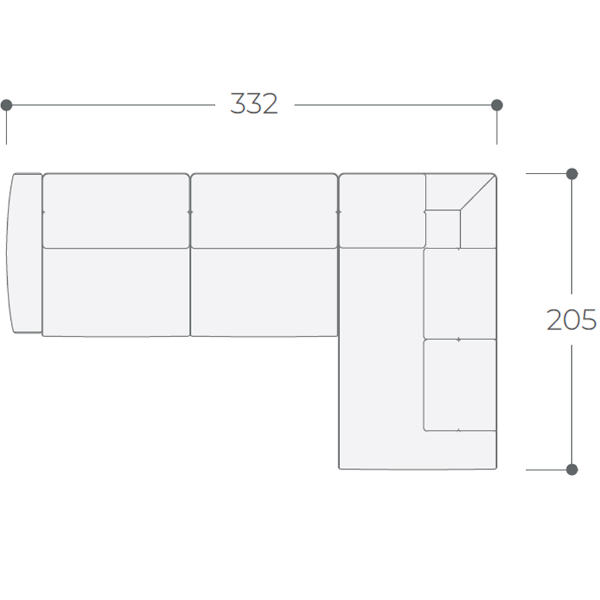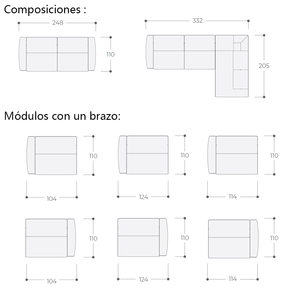 - 332x110/205 cm - RINCÓN TERMINAL (108x205 cm) + MÓDULO CON 1 BRAZO (124x110 cm) + MÓDULO SIN BRAZO (100x110 cm)