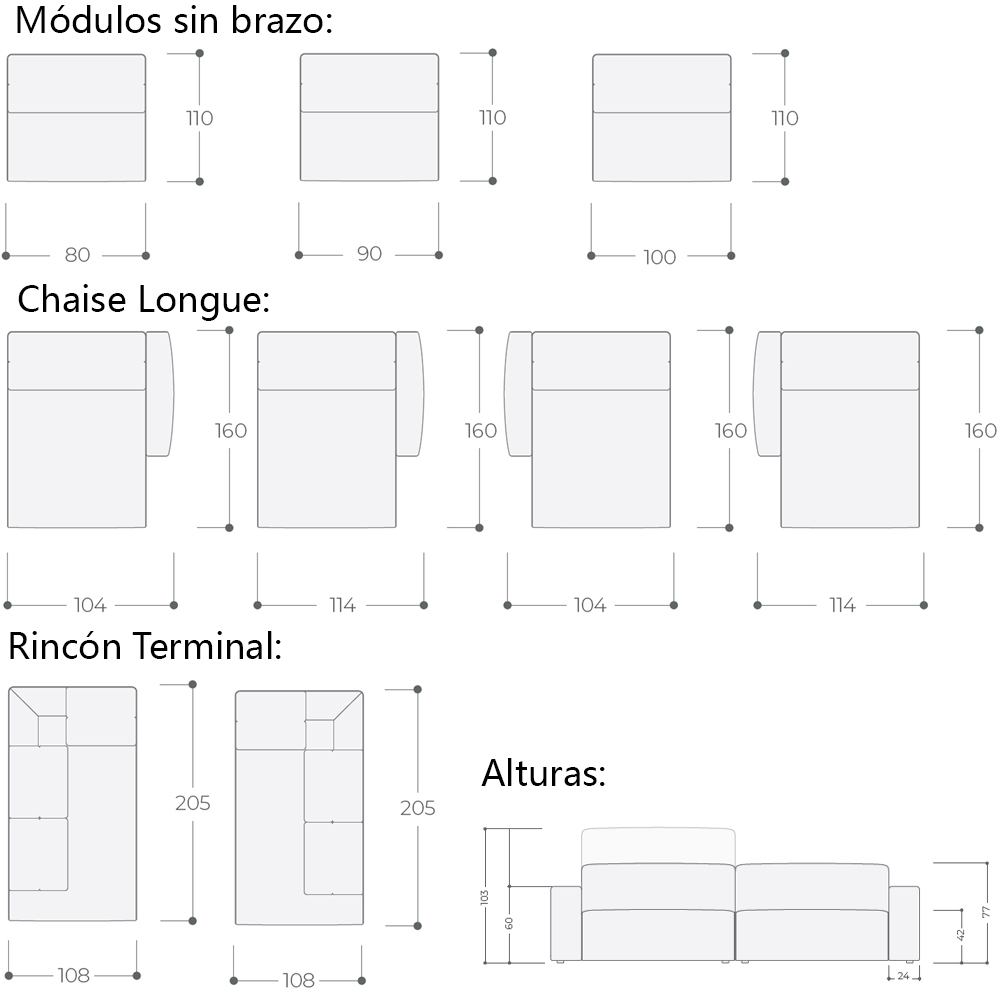 Dimensiones (las alturas no son especificadas, ya que son iguales para todos los modulos 77/103h cm):