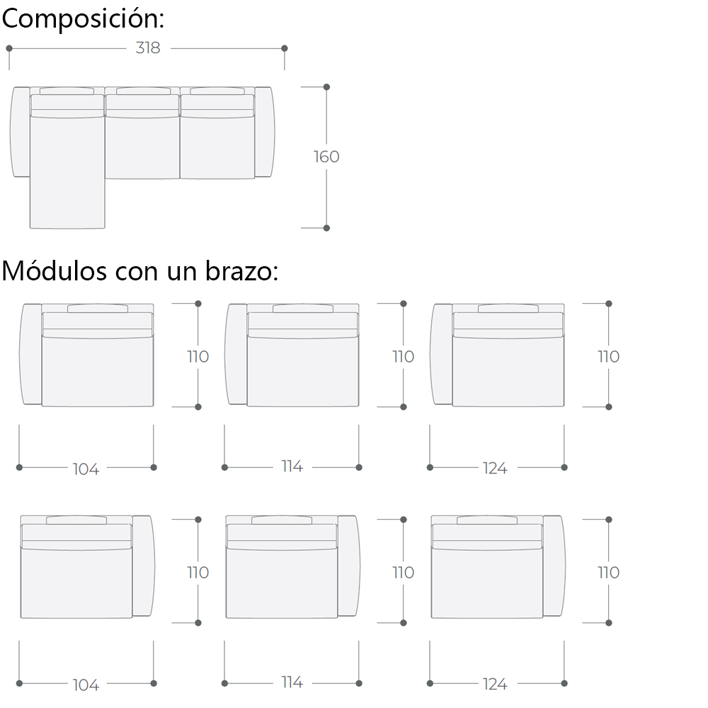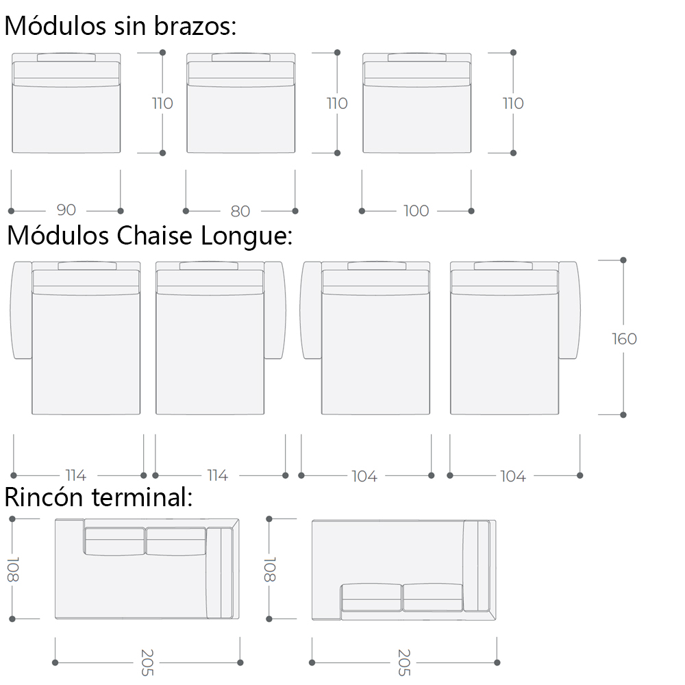 Dimensiones (las alturas no son especificadas, ya que son iguales para todos los modulos 96h cm):