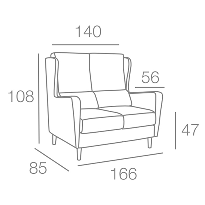 Sofá fijo tapizado de 2,5 plazas con patas de madera. Dimensiones: 166x85x105h cm.