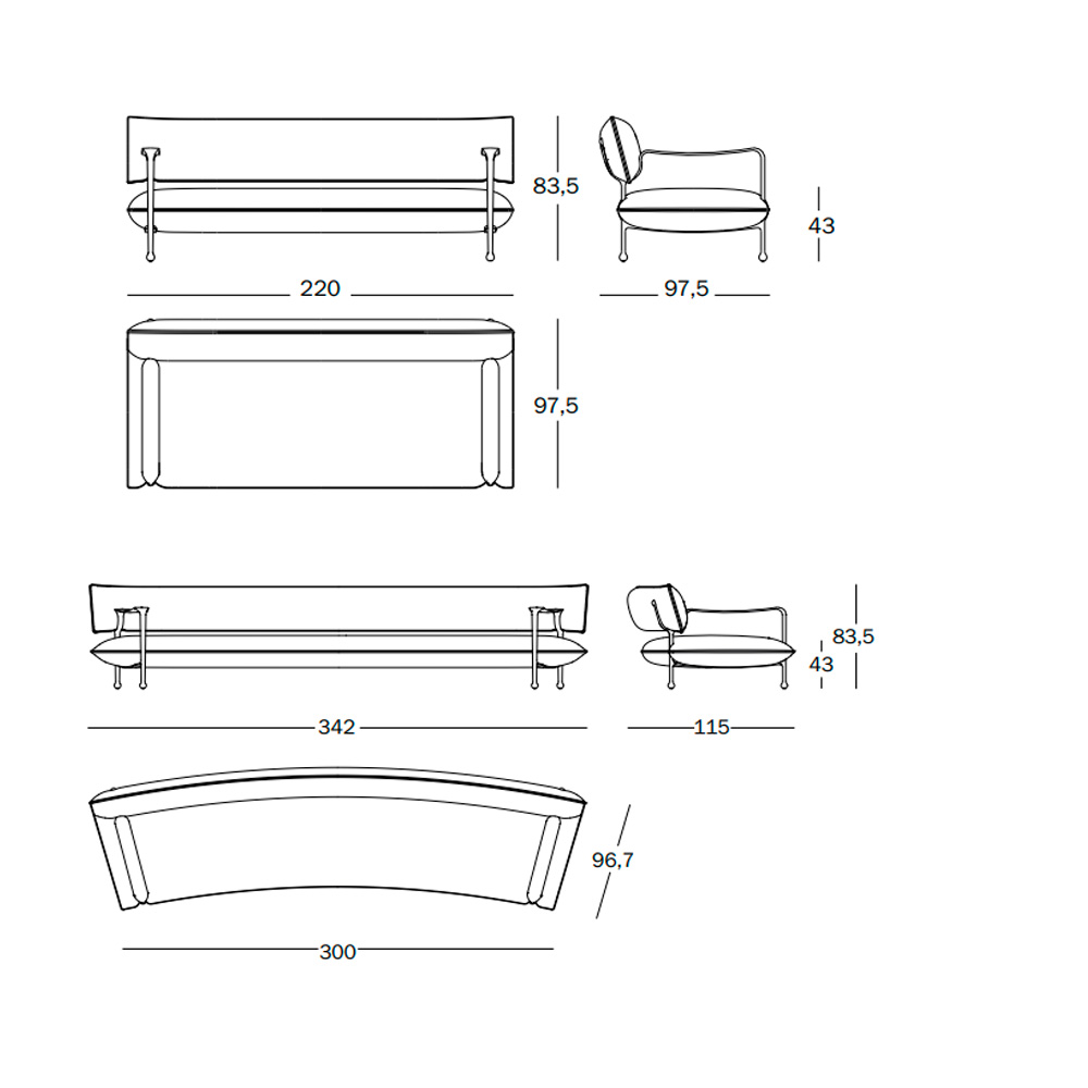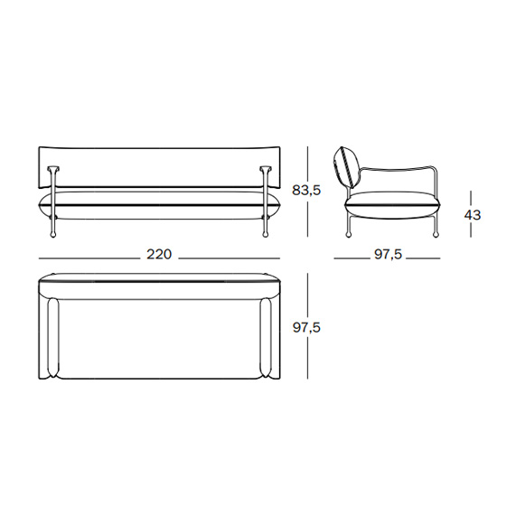 Igualmente escultural y sinuoso, el sofá moderno tiene una esbelta estructura de bronce blanco que sostiene un asiento y un respaldo tapizados anchos y aparentemente suspendidos.