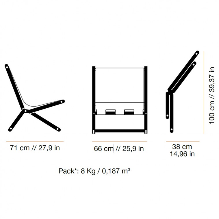Asiento y respaldo fabricado en tela de poliéster procedente de una vela recuperada y tensada en tres de las barras. Válido para exteriores.