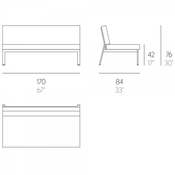 Incluye colchonetas (asiento + respaldo) recubiertas con tejido hidrófugo desenfundables en diferentes acabados y (2) Cojines de 60x25cm del mismo acabado que el sofá.