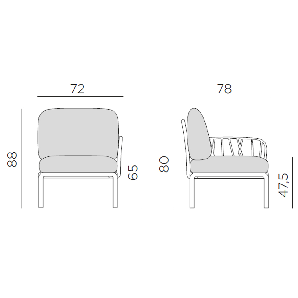 La butaca de exterior Komodo Elemento Terminal de Nardi cuenta con un brazo izquierdo o derecho de resina de fibra de vidrio y acolchados.