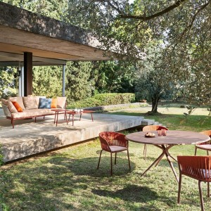 El sofá de exterior Ria de Fast se destaca por su tejido completo envolvente y 2 dimensiones, que responde al deseo de vivir al aire libre en diferentes entornos, situaciones y estaciones, siempre en nombre de la practicidad y la comodidad.