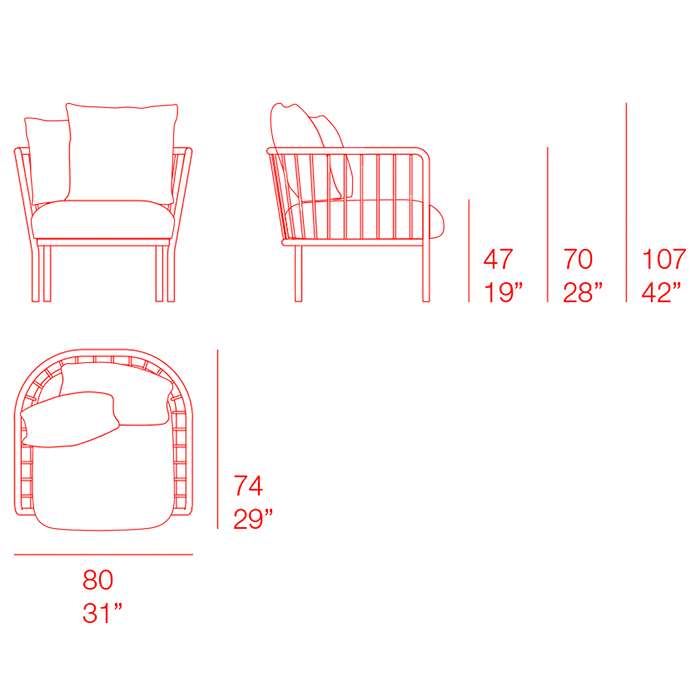 Sillón exterior con base de aluminio diseño de Made Studio. Dimensiones: 74x80x107h cm.