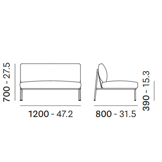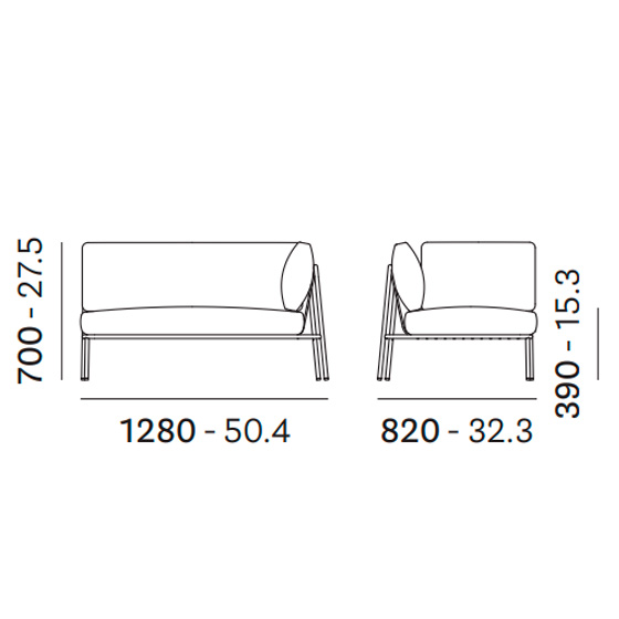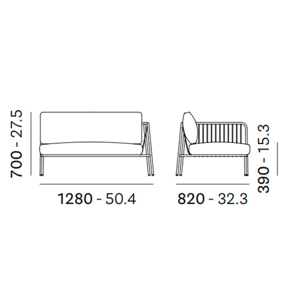 Módulo esquinero derecho con estructura en tubular de acero pintado para exterior, cojines de asiento en espuma de poliuretano y respaldo en poliéster, protegidos por una funda impermeable y tapizados con tejido para exterior o de polipropileno. Disponible con o sin cojín lateral.