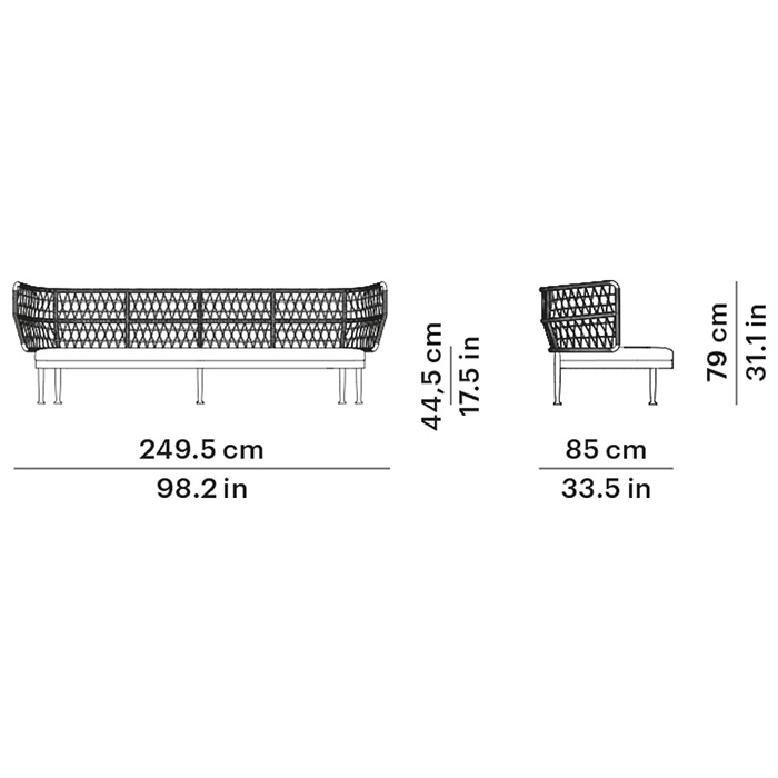 Dimensiones: 249,5x85x79h cm. (Altura de asiento 44,5cm)