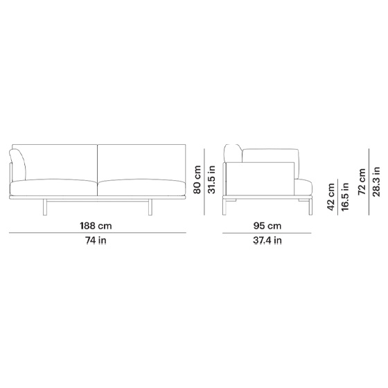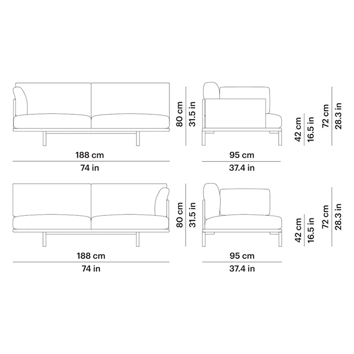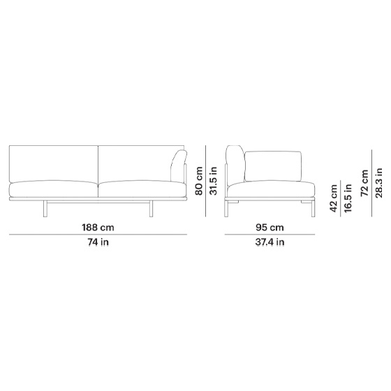 Sofá de dos plazas con módulo de brazo izquierdo o brazo derecho, fabricado con estructura de aluminio pintado en polvo y patas regulables. Disponible en los acabados Gris Metalizado 56 y Blanco Mineral 34.