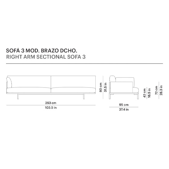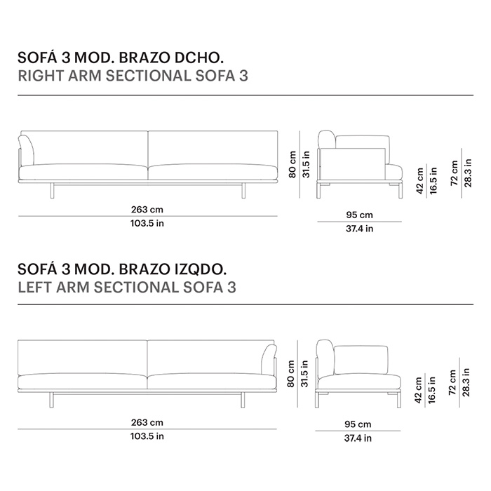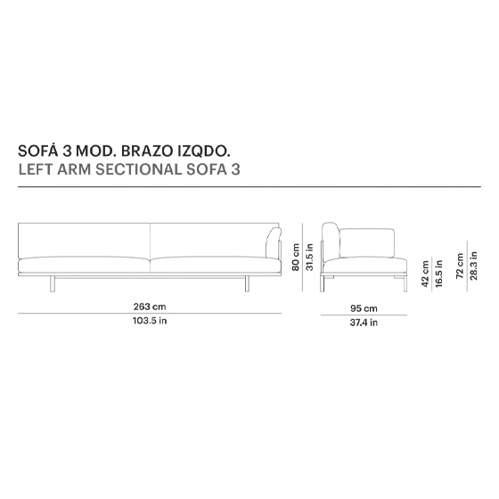 Sofá de tres plazas con módulo de brazo izquierdo o brazo derecho, fabricado con estructura de aluminio pintado en polvo y patas regulables. Disponible en los acabados Gris Metalizado 56 y Blanco Mineral 34.