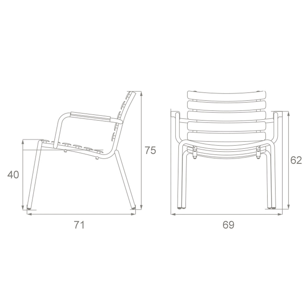 Sillón lounge con estructura y asiento de aluminio con recubrimiento en polvo. Dimensiones: 69x71x75h cm