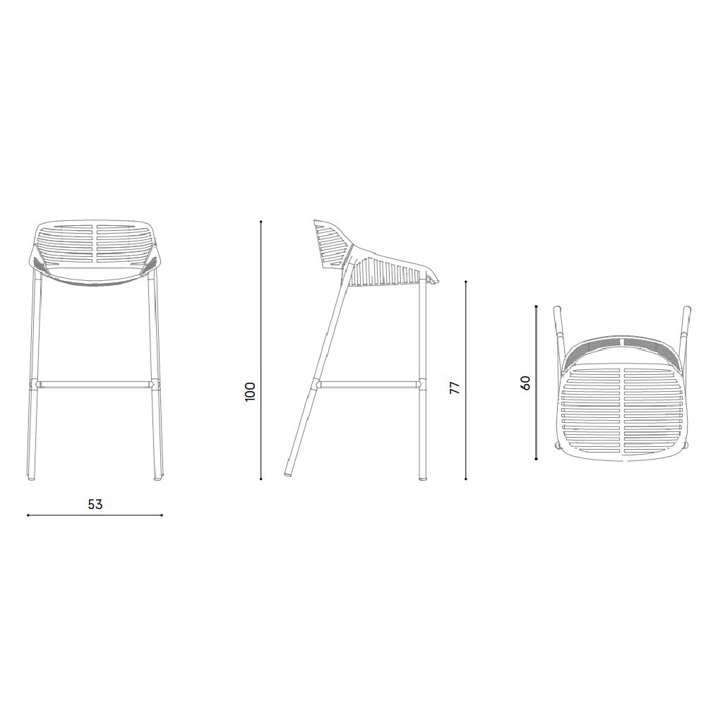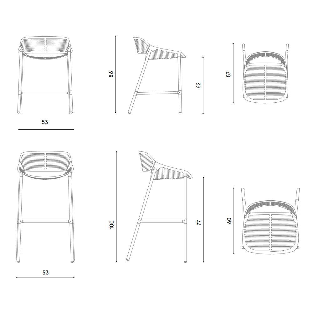 Taburete con estructura de aluminio lacado y reposapiés de acero inoxidable pulido.